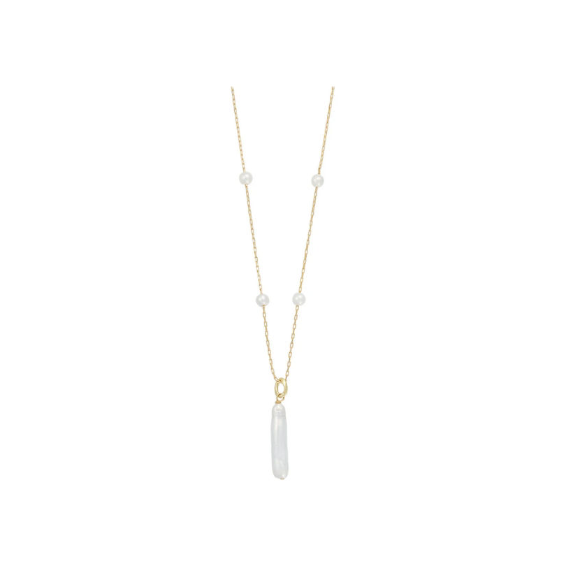 Halskæden er fremstillet i en metallegering og 14 k guldbelagt og er dekoreret med ferskvandsperler, hvilket giver smykket en naturlig og feminin glød.